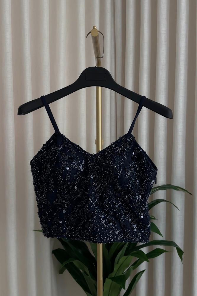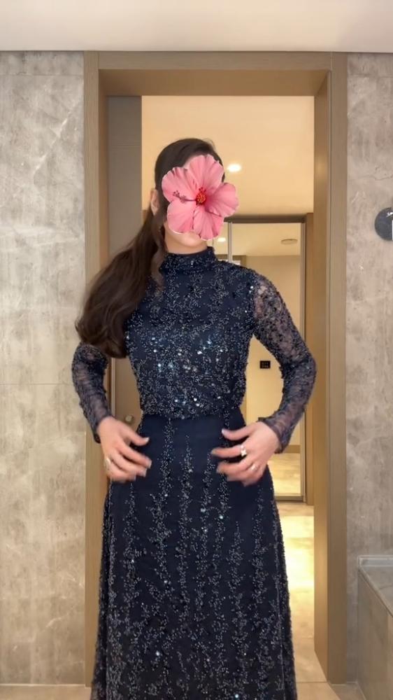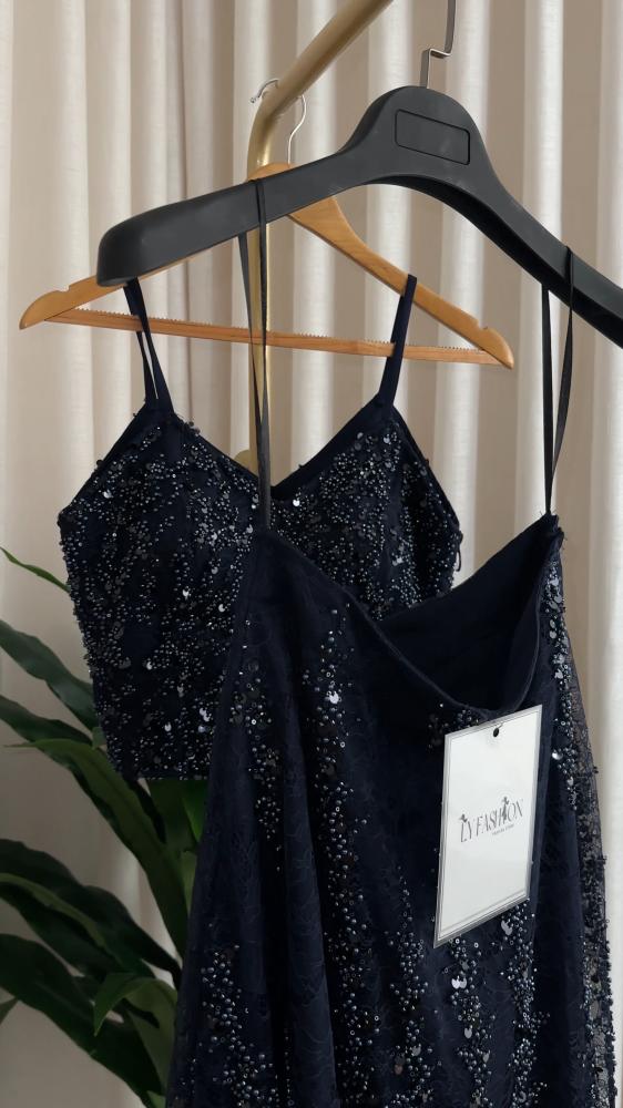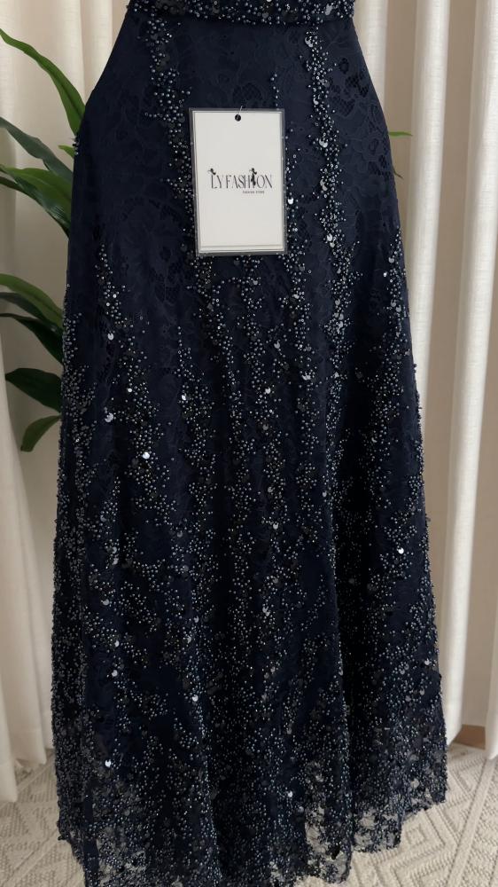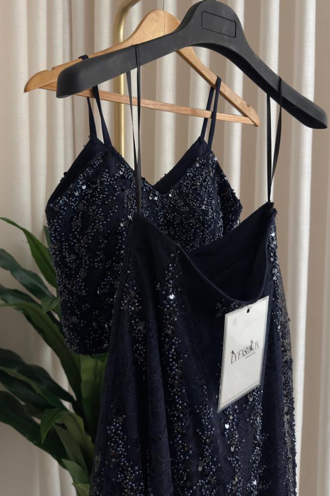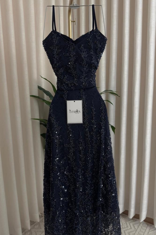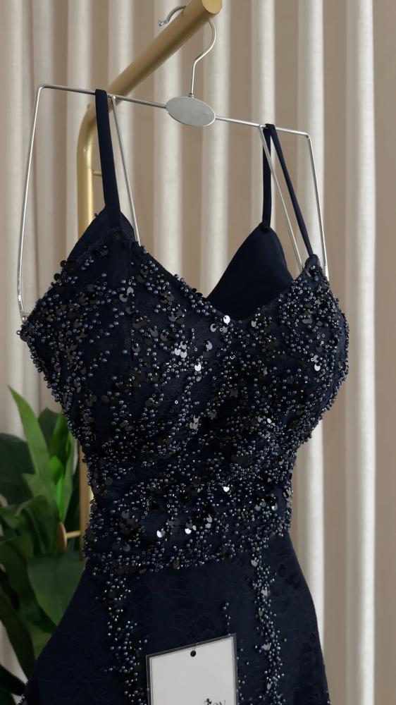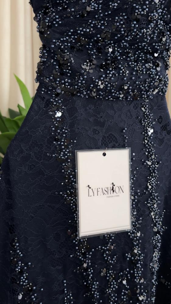طقم سهرة فاخر بتصميم كلاسيكي، يجمع بين الرقي والبساطة في آنٍ واحد. يأتي بلون كحلي داكن يعكس الفخامة، ويُبرز تفاصيله البراقة بطريقة أنيقة دون مبالغة.