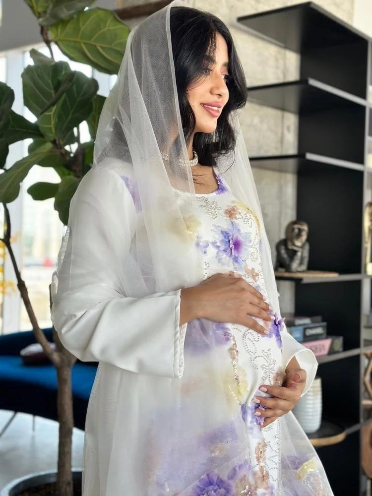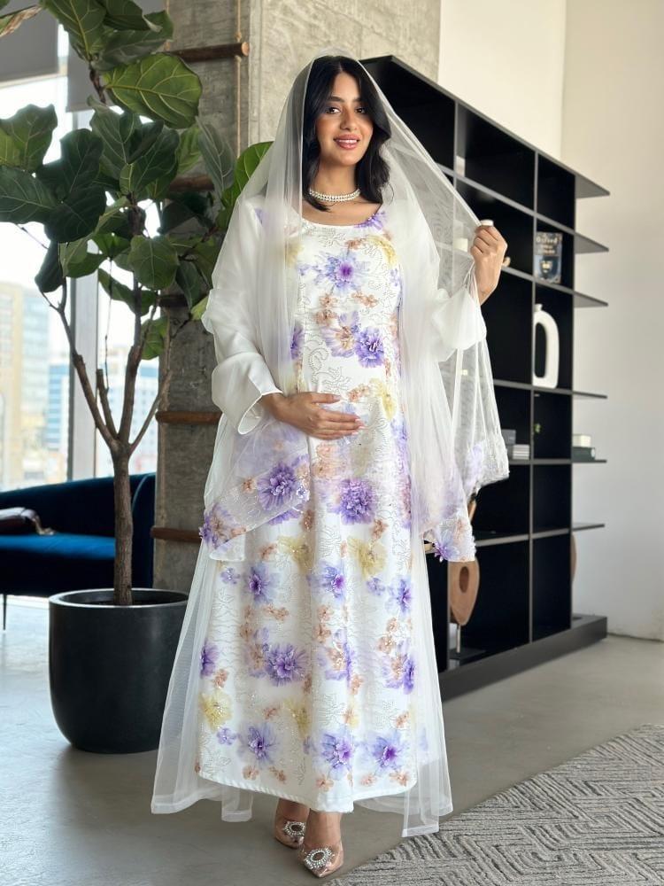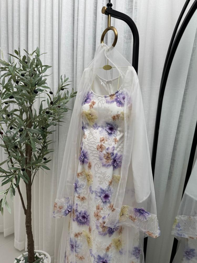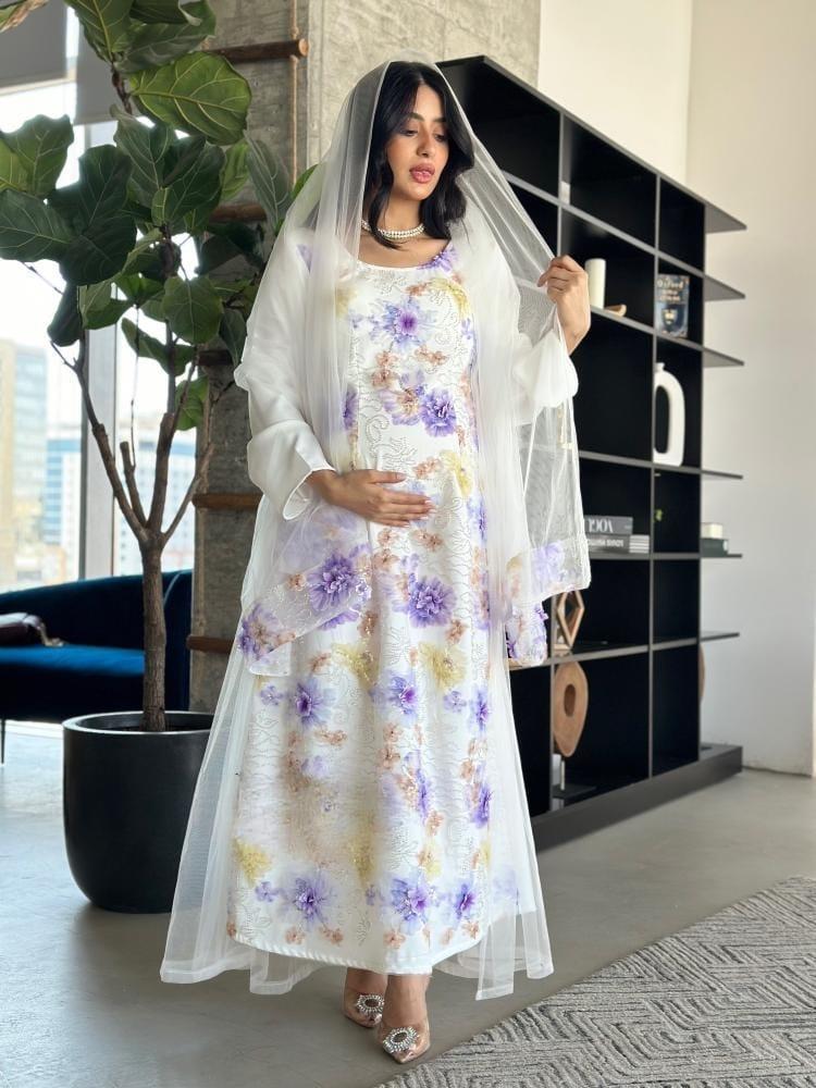 فستان طويل بأكمام طويلة مصنوع من قماش شفاف خفيف، مزين بنقشات زهرية بألوان متعددة مثل البنفسجي والأصفر. الفستان مزود بطرحة شفافة تضيف عليه لمسة من الأناقة والرقي. الفستان مناسب للمناسبات الخاصة ويعطي مظهراً أنيقاً وجذاباً.