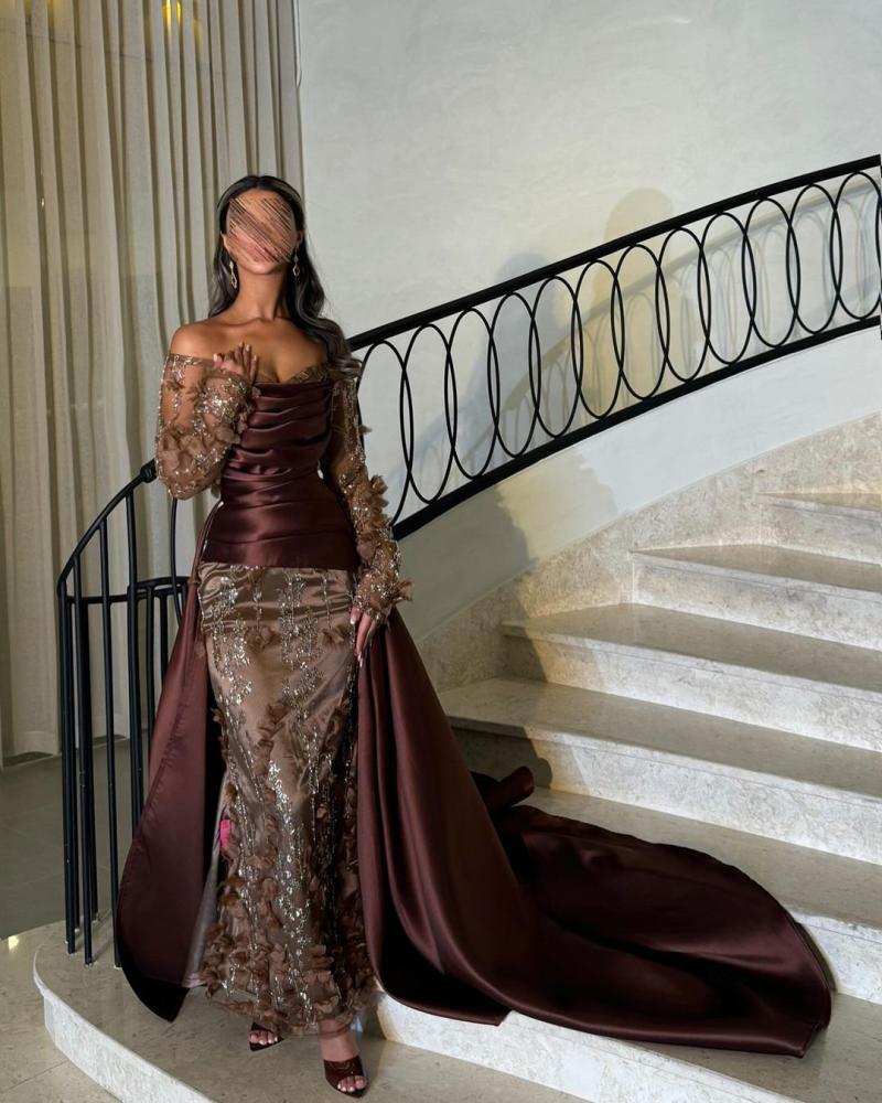 فستان طويل وأنيق مصنوع من قماش لامع باللون البني الداكن، مع تطريزات زهرية على الجزء السفلي. يتميز الفستان بأكمام شفافة مزينة بنقوش زهرية، وله ذيل طويل ينسدل على الأرض. الفستان يجمع بين الأناقة والفخامة، ويبرز جمال من ترتديه.