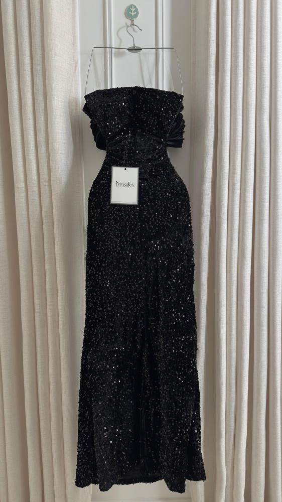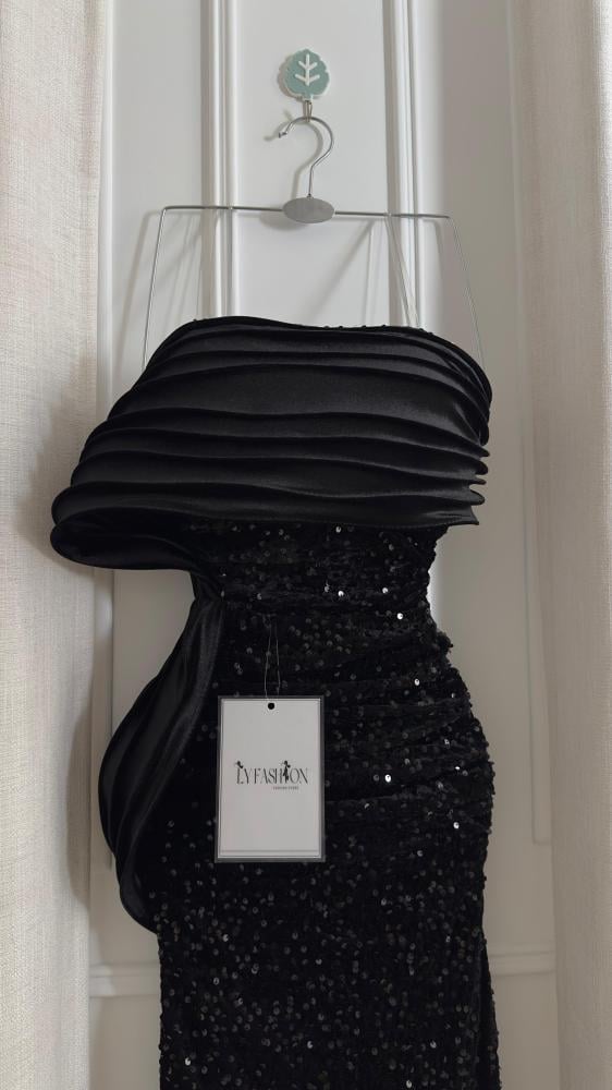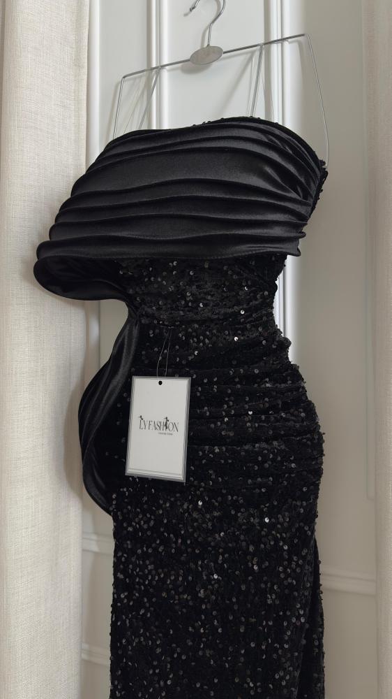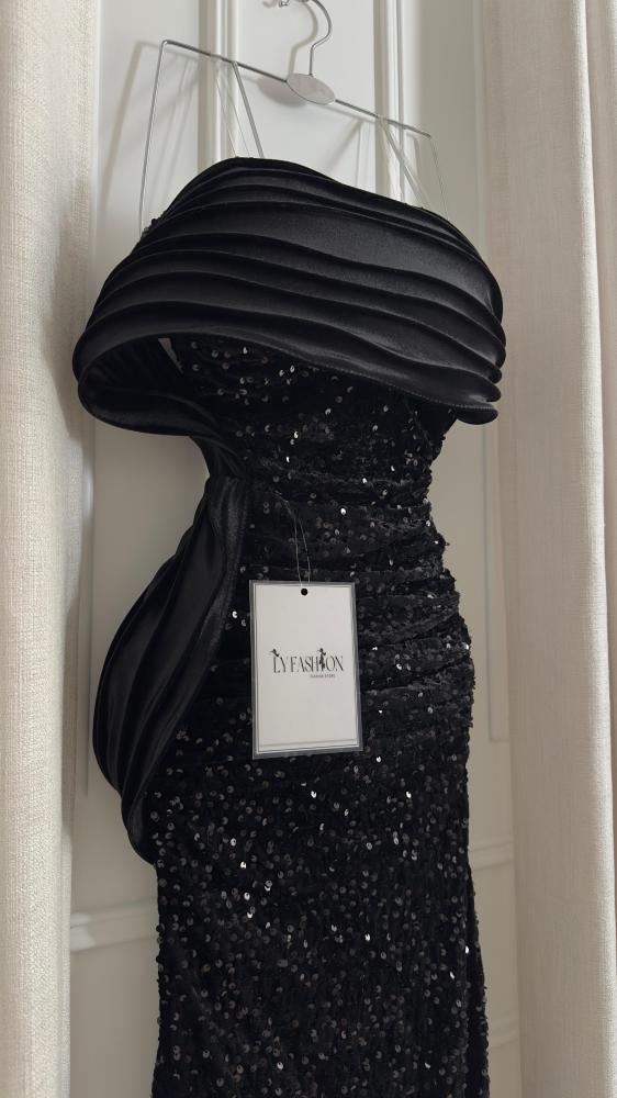 - الخامة: الجزء السفلي مغطى بـ ترتر أسود لامع يمنح الفستان بريقًا جذابًا تحت الإضاءة، ويضفي عليه طابعًا احتفاليًا.