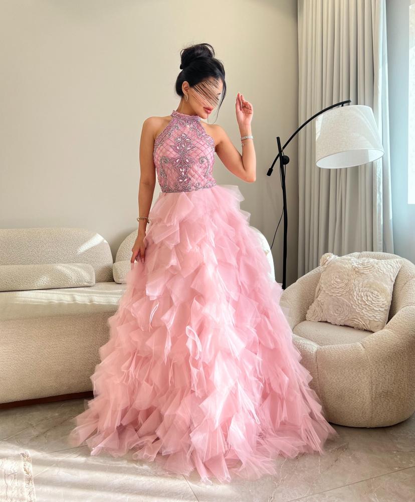 فستان طويل بلون وردي فاتح مع تطريزات زهرية بيضاء، يتميز بتصميمه الأنيق والراقي. يناسب المناسبات الخاصة ويضفي لمسة من الجمال والرقي على من ترتديه.