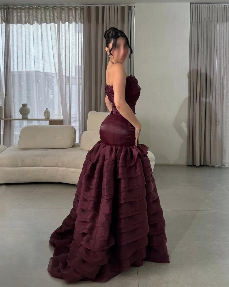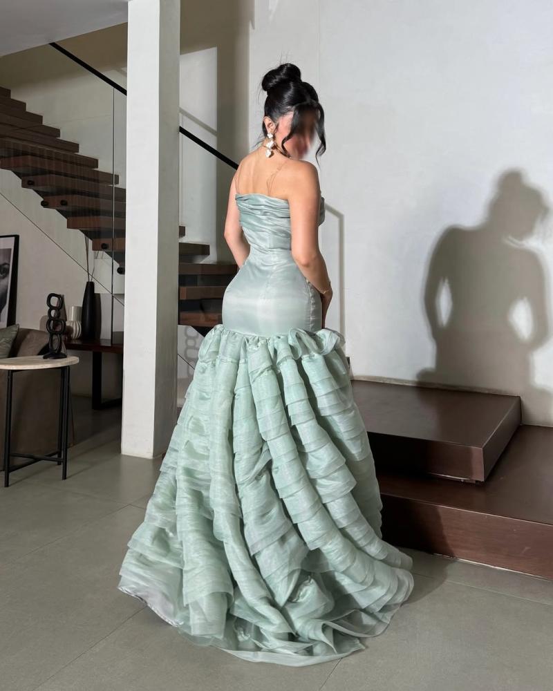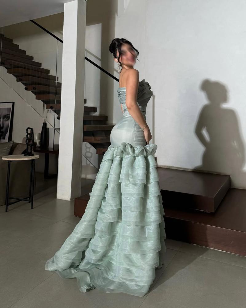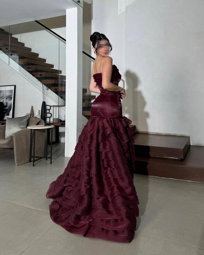 فستان طويل ، يتميز بتصميم أنيق وجذاب. الجزء العلوي من الفستان ضيق ويبرز جمال القوام، بينما الجزء السفلي يتكون من طبقات متعددة من القماش تضيف عليه مظهراً فاخراً ومميزاً. النعومة والإنسيابية في الخامة تعطي إحساساً بالرقي، ليكون الخيار المثالي لإطلالة راقية