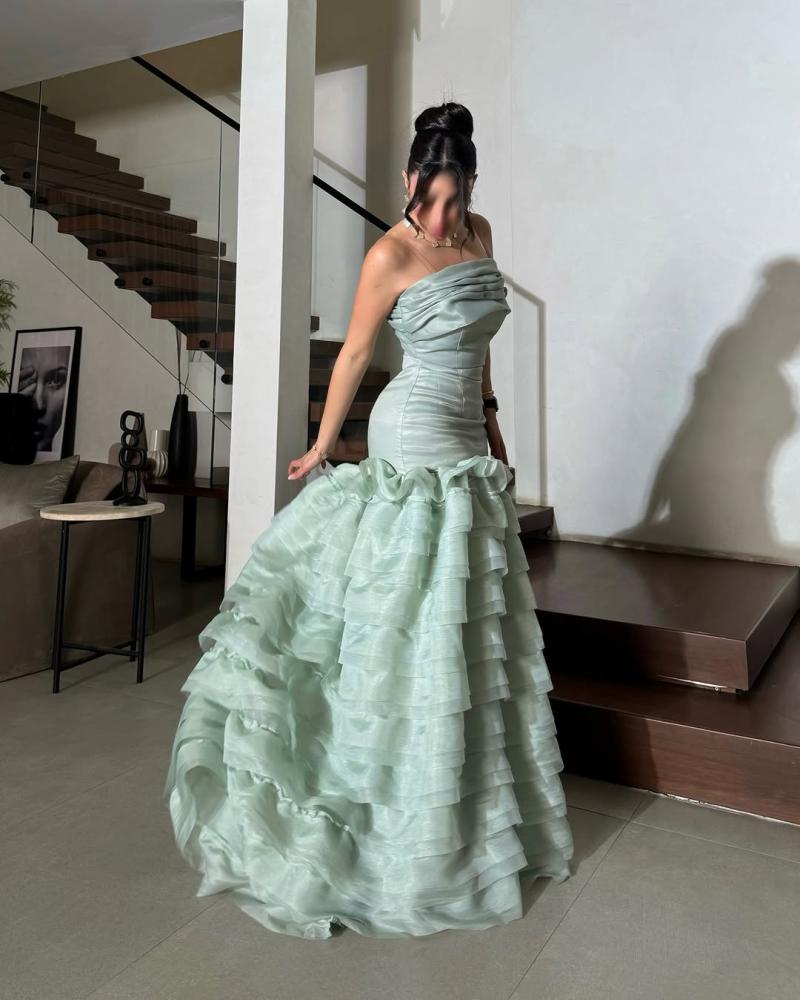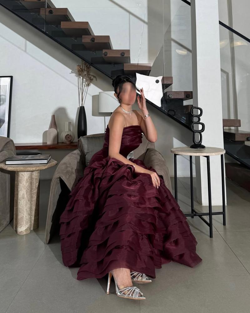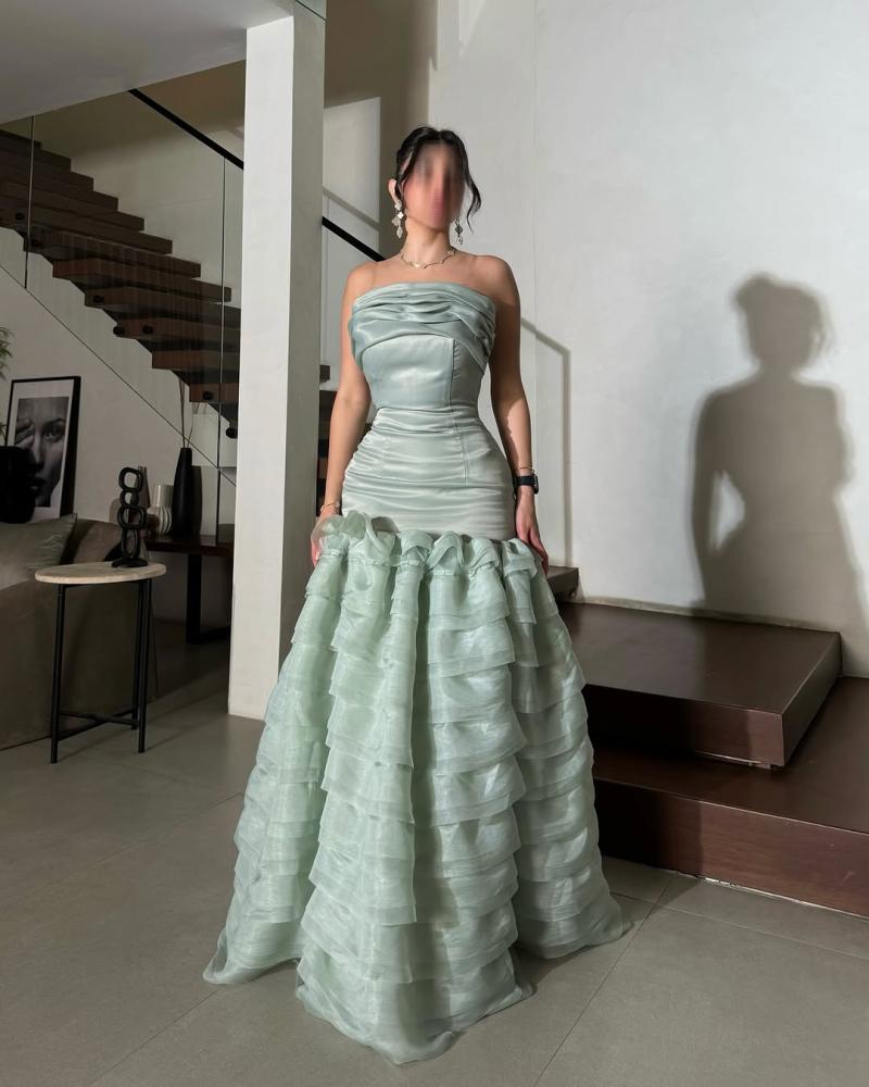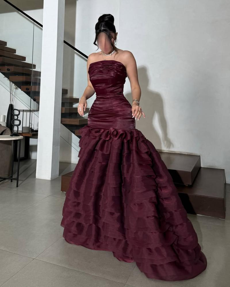 فستان طويل ، يتميز بتصميم أنيق وجذاب. الجزء العلوي من الفستان ضيق ويبرز جمال القوام، بينما الجزء السفلي يتكون من طبقات متعددة من القماش تضيف عليه مظهراً فاخراً ومميزاً. النعومة والإنسيابية في الخامة تعطي إحساساً بالرقي، ليكون الخيار المثالي لإطلالة راقية