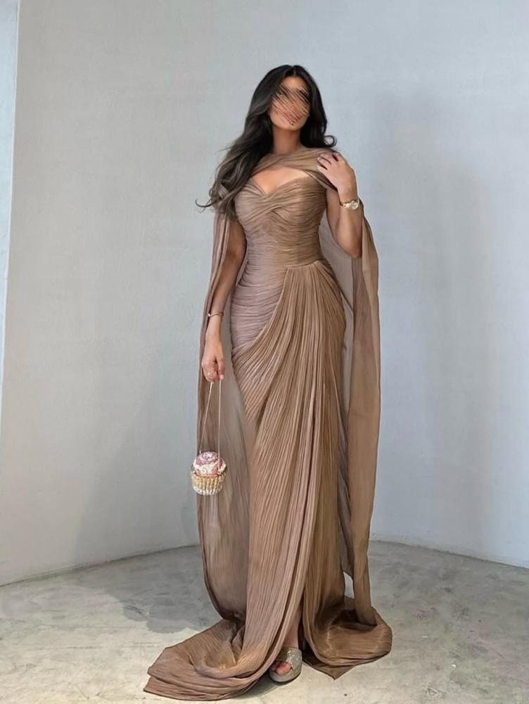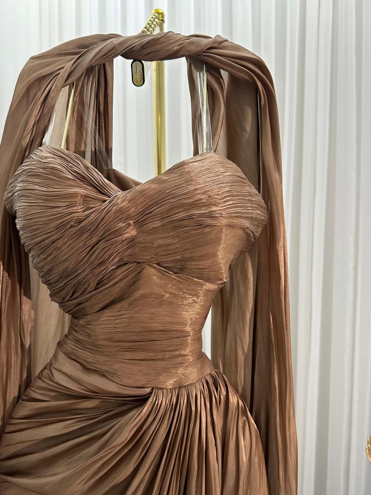 فستان سهرة فاخر بلون موكا فاتح يتميز بتصميم انسيابي يجمع بين الرقي والجرأة. القماش اللامع والمثني بدقة يمنح الفستان ملمسًا ناعمًا وحركة ديناميكية جذابة عند المشي. يأتي بقصة ضيقة عند الخصر مع صدرية بقَصّة قلب تُبرز منطقة الصدر بأسلوب أنثوي راقٍ.