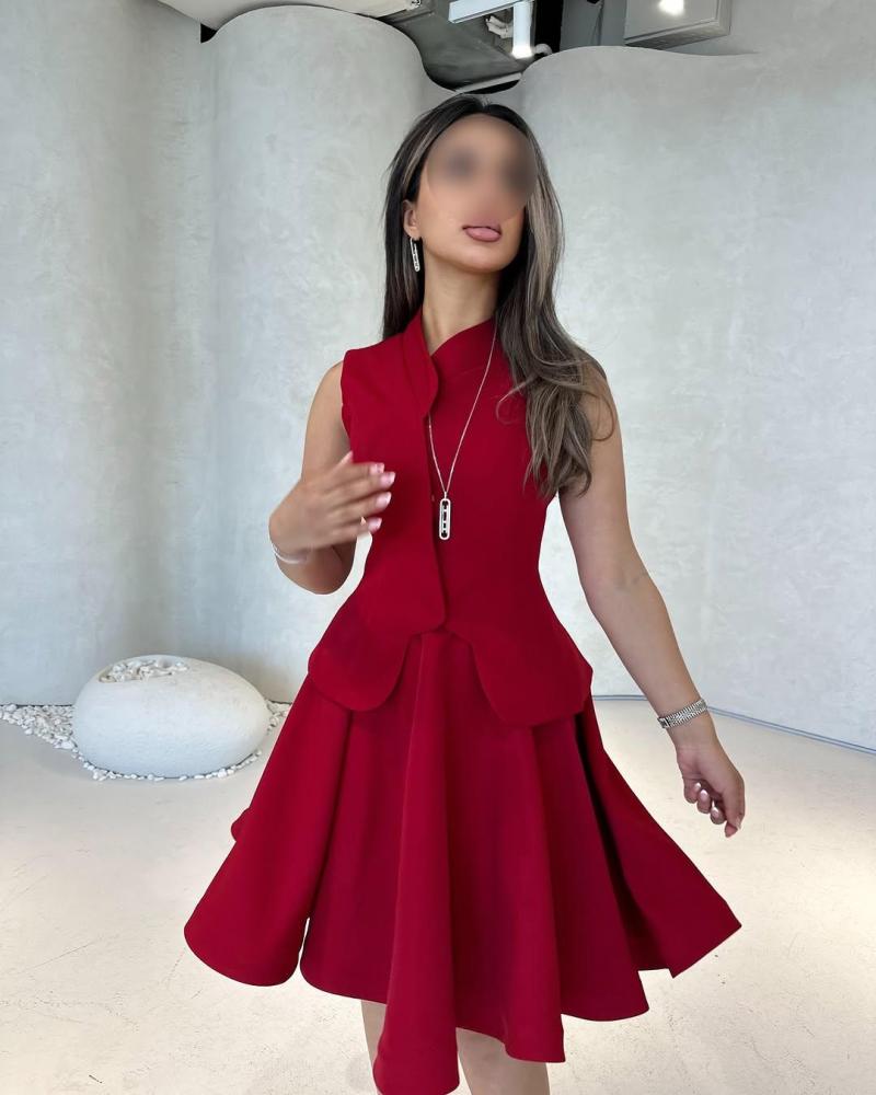 فستان سهرة قصير باللون الأحمر الداكن، يتميز بتصميمه الأنيق والبسيط. الفستان بدون أكمام وله ياقة مرتفعة، مما يضيف عليه لمسة من الرقي. القماش يبدو ناعماً وملائماً للجسم، مع تنورة واسعة تضيف حركة وجاذبية عند المشي. الفستان مثالي للسهرات والمناسبات الخاصة، ويعكس ذوقاً رفيعاً وأناقة لا مثيل لها.