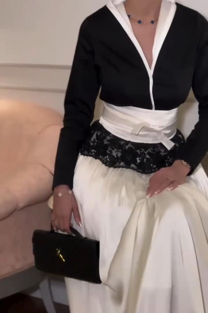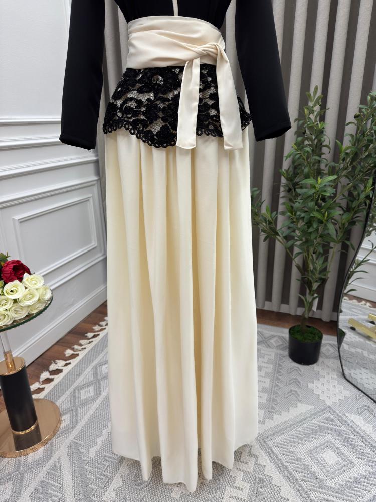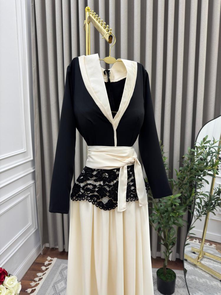 تصميم مميز يمزج بين الفخامة والبساطة، حيث يأتي الفستان بلون أسود مع ياقة بيضاء تضيف لمسة من الرقي. حزام أبيض يلتف حول الخصر ليبرز جمال القوام، مع تطريز دانتيل فاخر في الجزء السفلي الذي يُظهر الذوق الرفيع ويُكمل أناقة الفستان. هذا الفستان يُعبر عن الجمال الكلاسيكي والجاذبية الراقية.