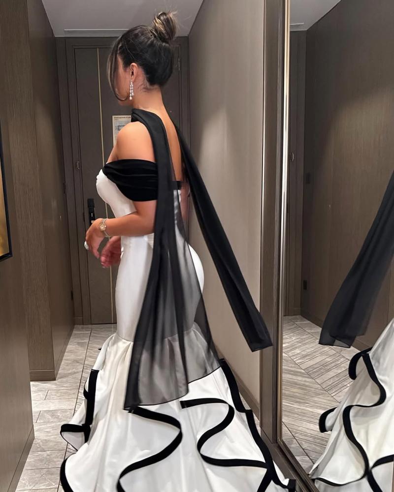 الفستان أبيض ضيق من الأعلى بتصميم يبرز تفاصيل الجسم بانسيابية راقية، مع جزء سفلي واسع يتموج بطيات كبيرة مرصعة بخطوط سوداء تضيف لمسة من الفخامة والجاذبية. بدون أكمام ليبرز جمال الأكتاف والرقبة بأسلوب راقٍ يعكس الذوق الرفيع. تصميمه يمزج بين البساطة الفاخرة والأناقة الهادئة ليكون الخيار الأمثل للمناسبات التي تحتاج إلى إطلالة ساحرة وراقية.