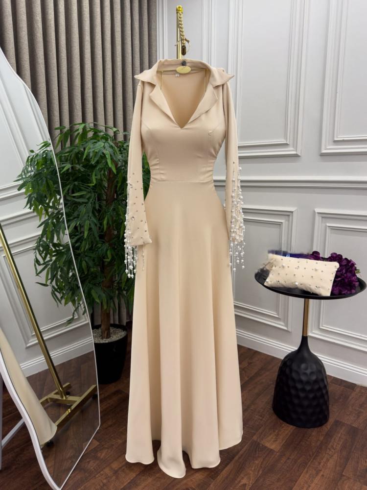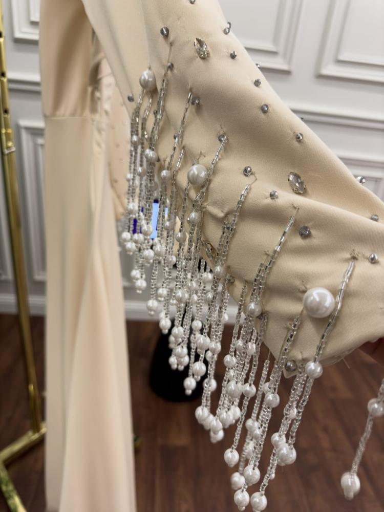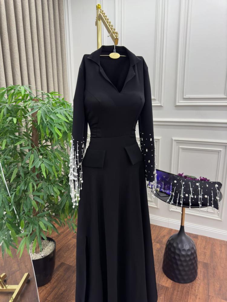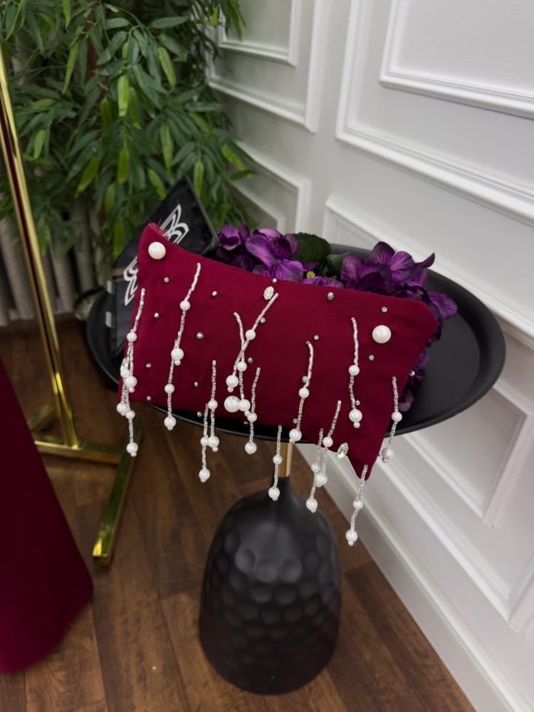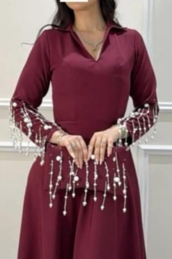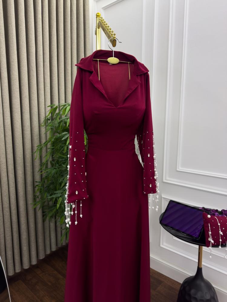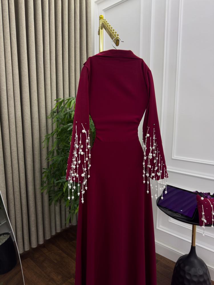 فستان طويل بلون برغندي يتميز بأكمام طويلة مزينة بحبات اللؤلؤ التي تتدلى بشكل جميل، مما يضيف لمسة من الأناقة والرقي. تصميمه الراقي يعانق القوام بأسلوب يعكس أنوثة رصينة وسحرًا هادئًا، يجعل من ترتديه محط الأنظار دون تكلف.