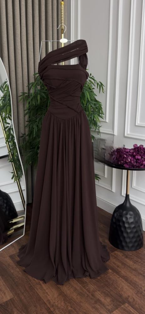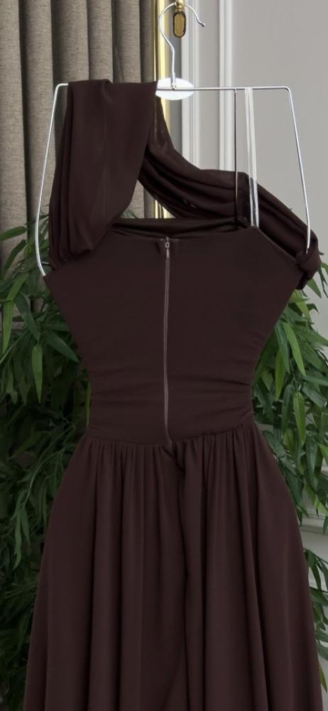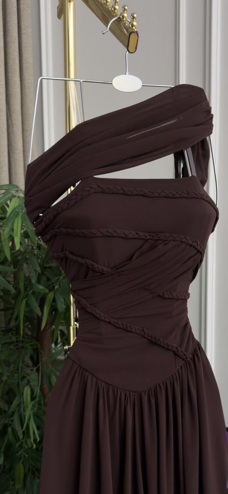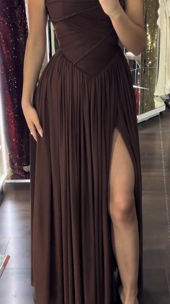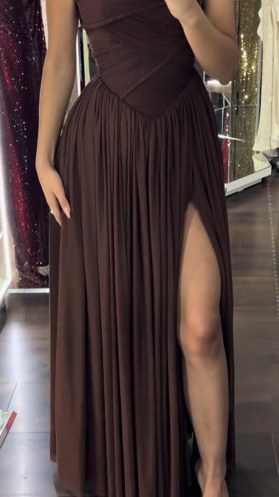 🟤 فستان سهرة بني داكن بفتحة ساق عالية – تصميم أنيق ومثير