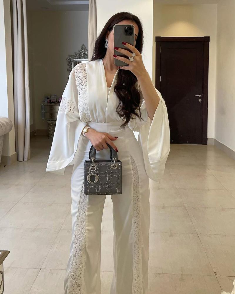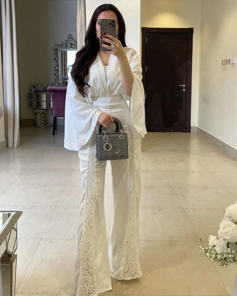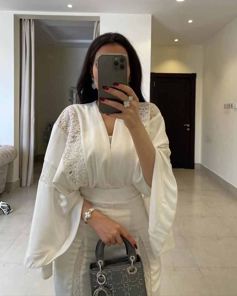 فستان أبيض طويل بأكمام واسعة، مصنوع من قماش ناعم ولامع، يتميز بتصميم أنيق وجذاب. الفستان مزود بحزام عند الخصر يبرز جمال القوام، ويحمل حقيبة يد صغيرة سوداء تضيف لمسة من الفخامة. الفستان مثالي للمناسبات الخاصة ويعكس ذوقًا رفيعًا وأناقة لا مثيل لها.